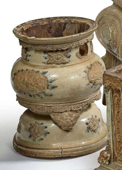 Đỉnh gốm kèm đế, trang trí men xanh trắng, trang trí rồng và hoa cách điệu
