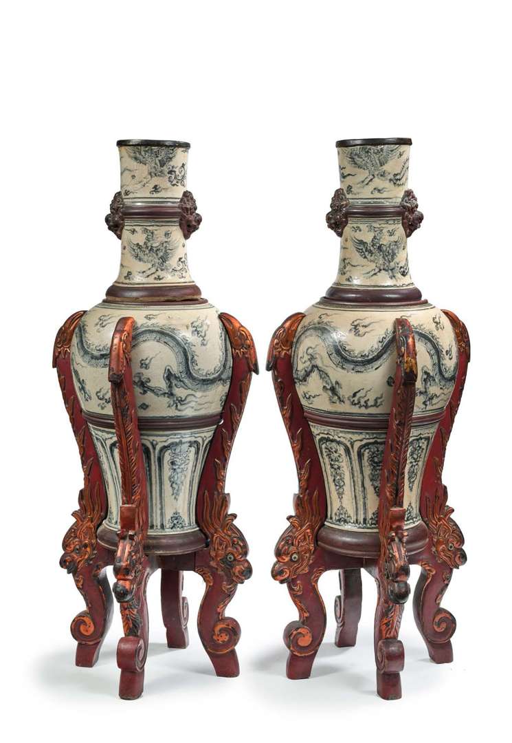 Đôi bình chân đèn bằng gốm sứ xanh trắng, men rạn, trang trí song long tranh châu. Cổ bình đắp nổi hình sư tử và phượng hoàng đang bay. Chân lọ trang trí hoa cỏ cách điệu. Đế lọ có bốn chân, làm bằng gỗ sơn son thếp vàng, tạo thành bốn con rồng, thế kỷ 19.
