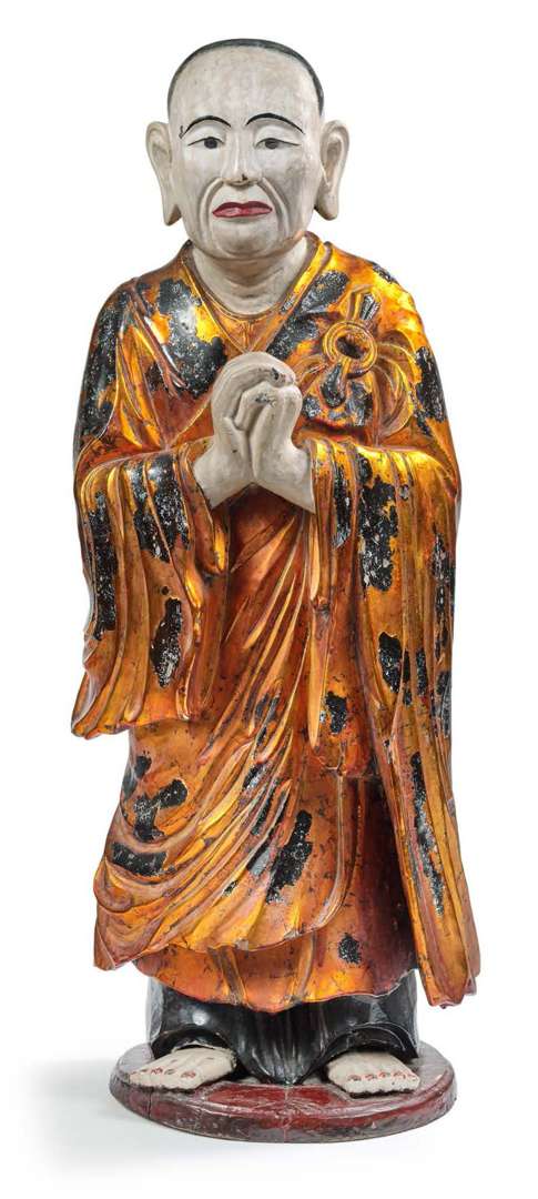Sculpture en bois laqué or et peinture polychrome, représentant un grand moine debout en habit bouddhique, les mains jointes en prière. Les traits du visage sont fins, les lèvres serrées rendant le faciès sévère malgré les yeux plutôt doux, la patine est douce.