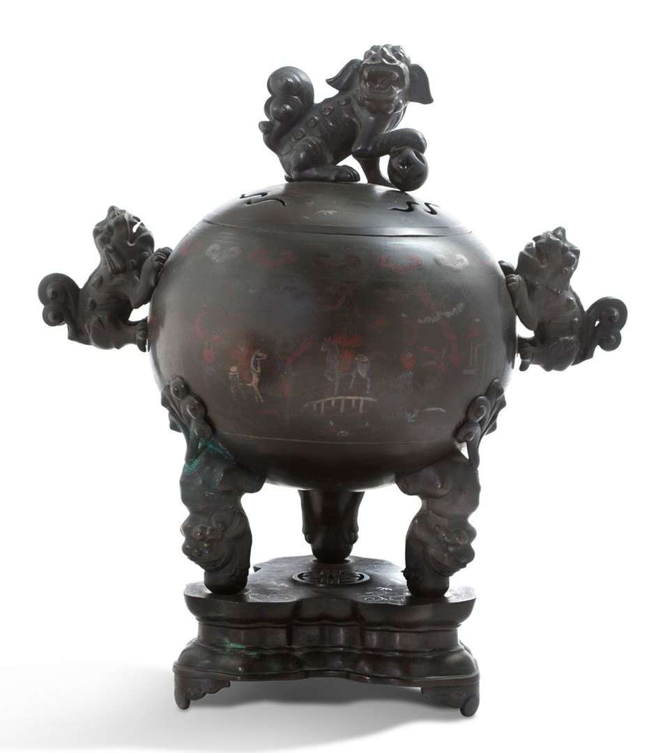 Brûle-parfum sphérique tripode couvert en bronze de patine médaille, à décor niellé d’argent de dignitaires à cheval et de leurs serviteurs, chauves-souris stylisées, la prise et les anses formant chilong, sur un socle présentant le caractère shou ajouré en son centre.