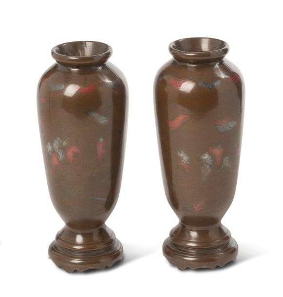 Paire de vases oblongues en bronze de patine médaille, à décor niellé d'argent de dignitaires à cheval accompagnés de leurs serviteurs, frises de chauves-souris stylisées près du col.