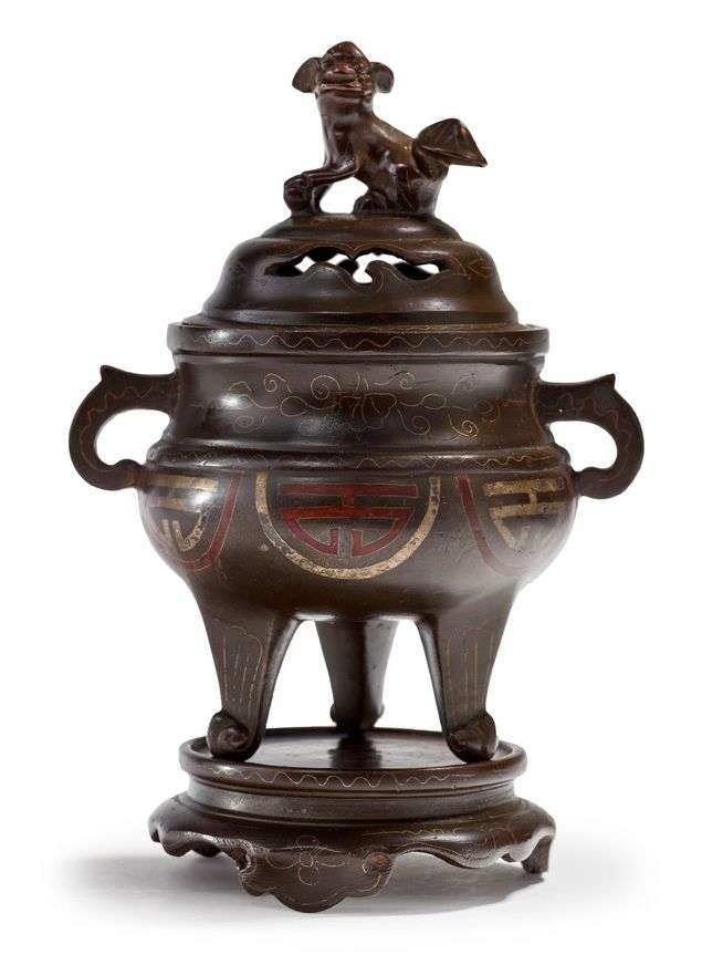 Brûle-parfum tripode en bronze de patine brune, à décor niellé du caractère Tho et rinceaux feuillagés, deux anses ornant la base du col, le couvercle ajouré est surmonté d’un lion. Avec son socle en bronze.