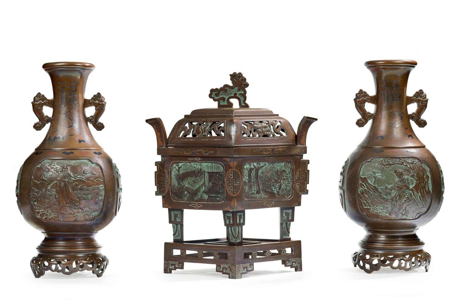 Garniture en bronze niellé d’argent comprenant une paire de vases et un brûle-parfum quadripode couvert et en forme de losange, la prise formant un lion bouddhique stylisé. Chaque élément reposant sur leur socle.