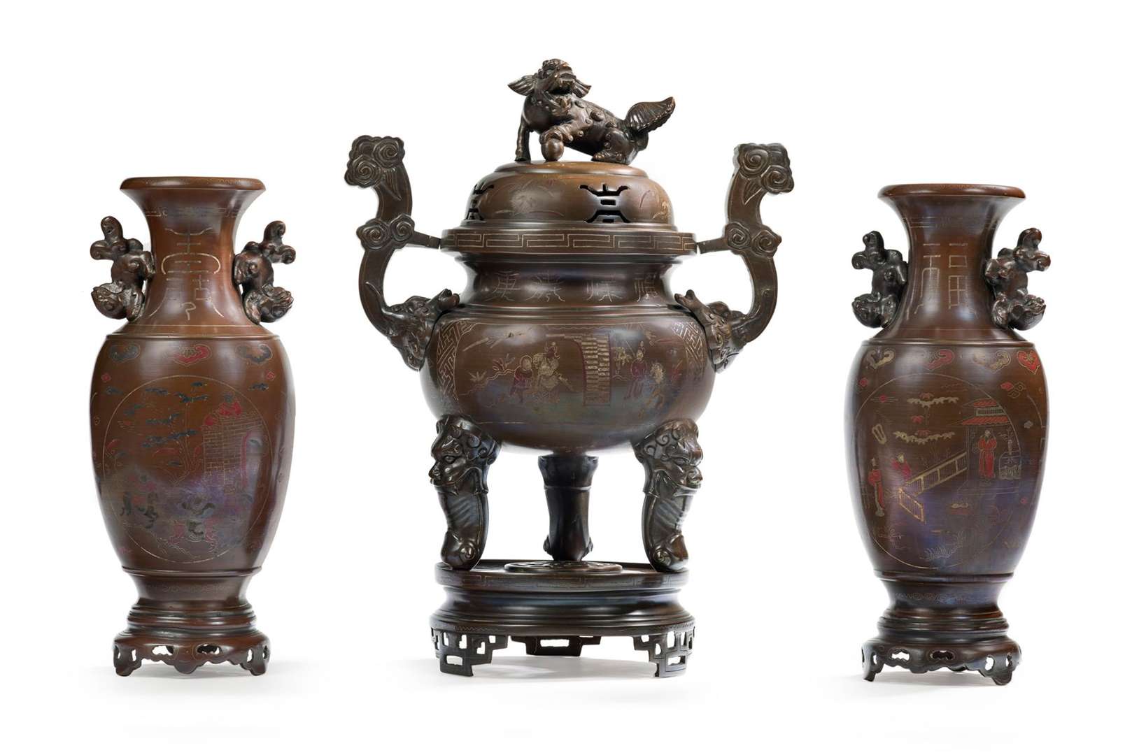 Garniture en bronze niellé d’argent comprenant une paire de vases et un brûleparfum tripode couvert, la prise formant chilong, les anses formant des têtes de ruyi reposant sur un socle.