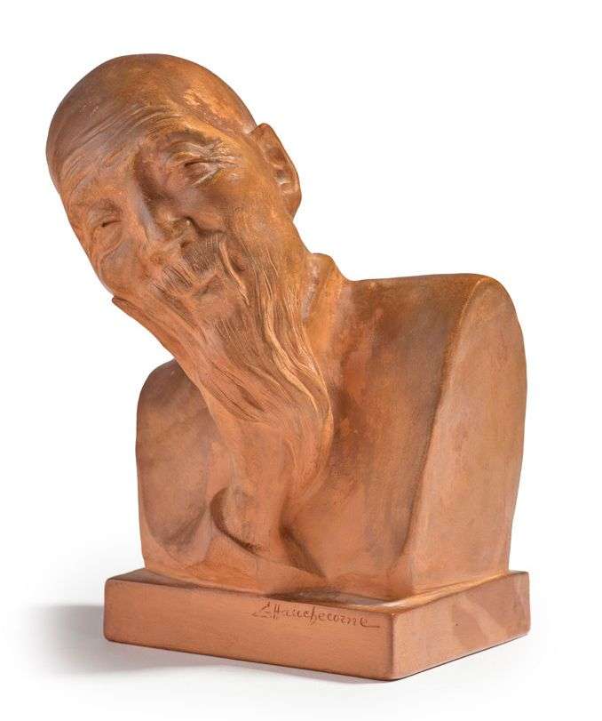 Buste en terre cuite représentant un lettré souriant à la longue barbe, la tête légèrement penchée, appuyée à sa main droite.