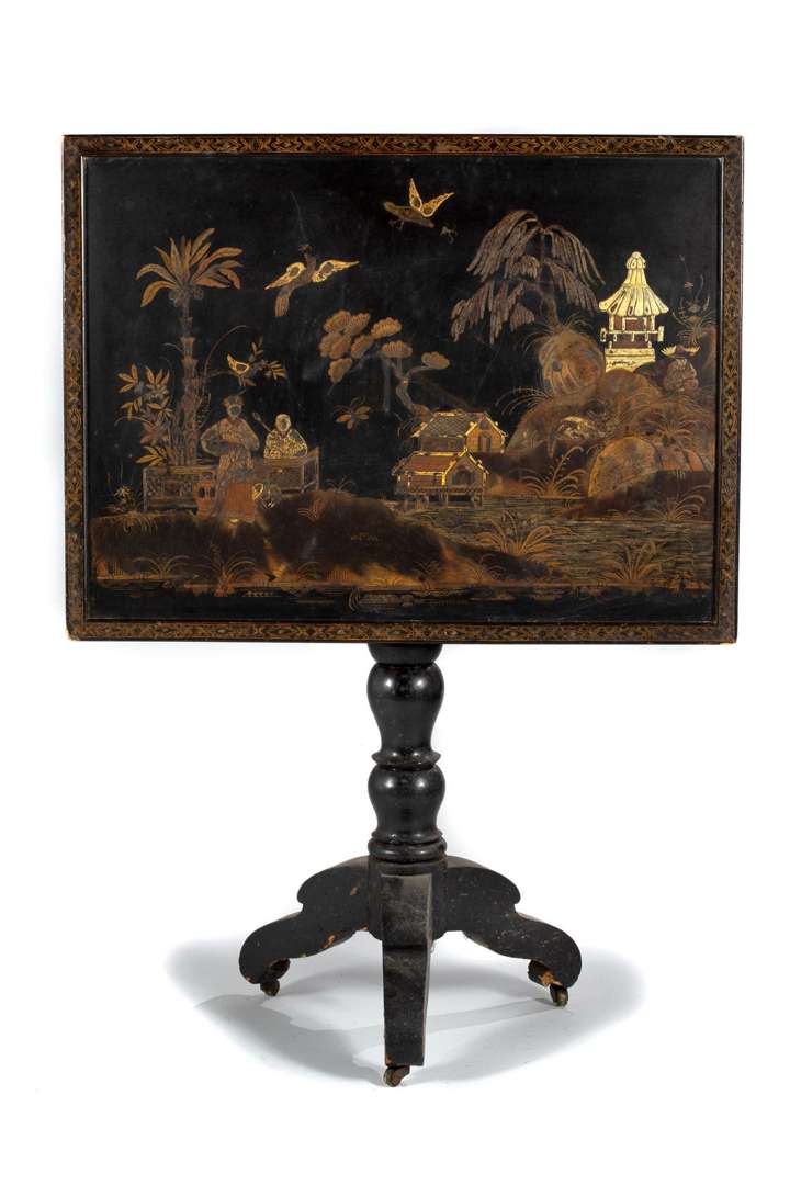 Petite table tripode en bois foncé noir à plateau dépliant à décor doré peint d’une femme accompagnée de deux oies passant devant un homme assis derrière un meuble, dans un paysage lacustre avec pavillons et pagode en partie supérieure.