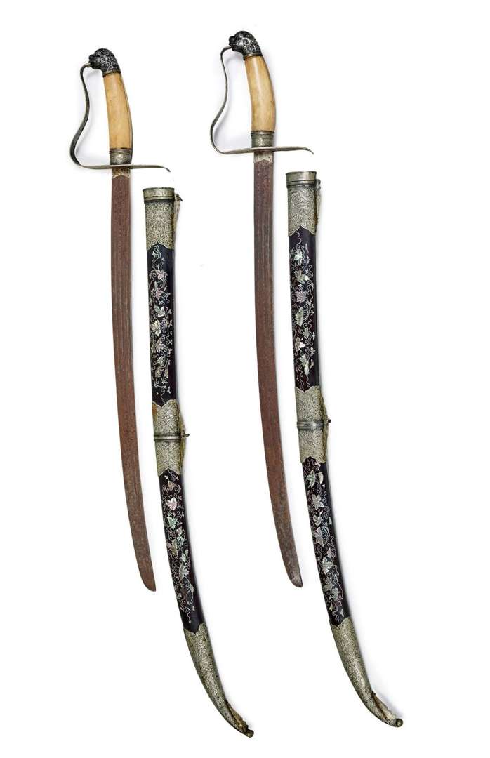 Les fourreaux en bois laqué incrusté de nacre à décor de motifs végétaux alternés de garnitures en métal repoussé à décor de têtes et corps de dragons stylisés.