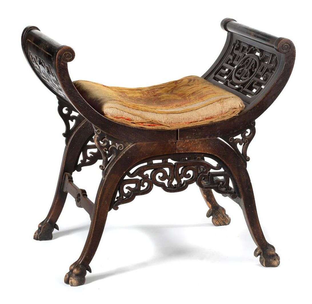 Siège de forme incurvée en bois de rose teinté garni d’un coussin orange et jaune en fil de soie représentant un personnage assis en majesté. Les accoudoirs à décor ajouré de motifs géométriques stylisés et d’un “H” stylisé dans un médaillon central sur chaque côté.