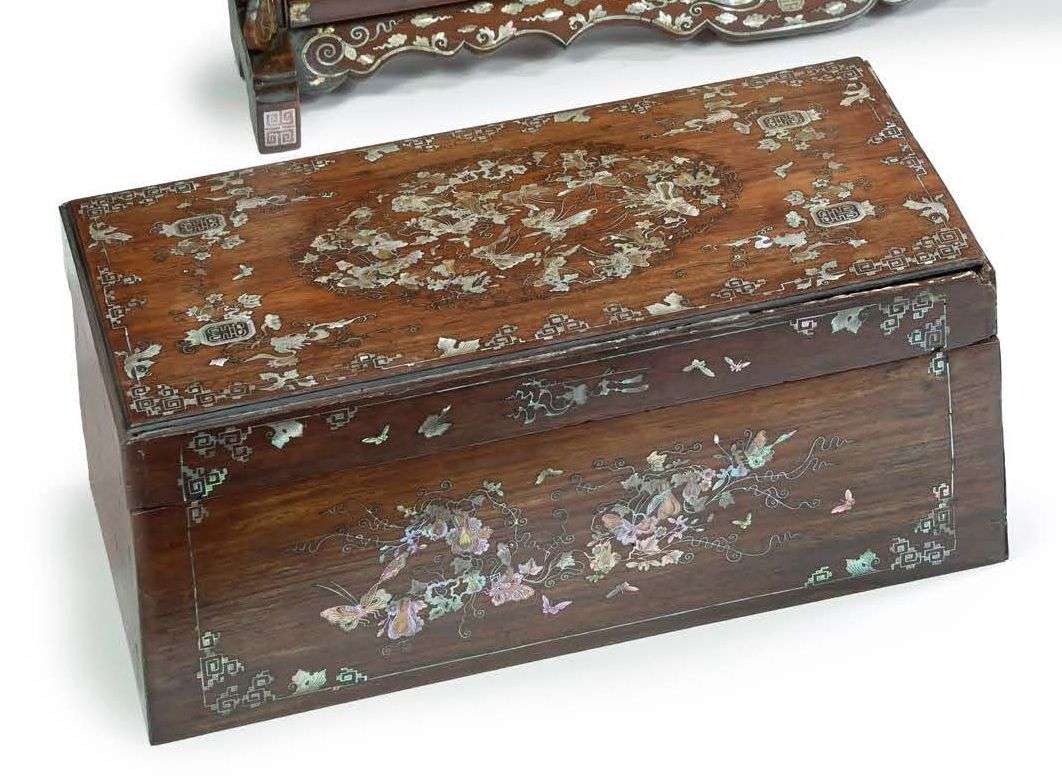 Coffret en bois de rose incrusté de nacre, le couvercle et les côtés à décor centré de papillons, fleurs et coloquintes, entourés de motifs floraux et stylisés soulignant les pourtours.Dim. 13 x 33 x 19,7 cm