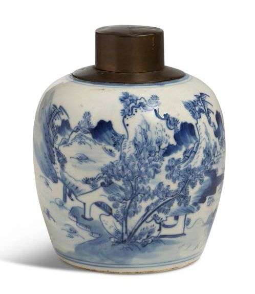 Petit pot en porcelaine blanche, à décor sous couverte, à décor d’un pavillon sur les bords d’un lac entouré de pics montagneux, près duquel se trouve un pêcheur.