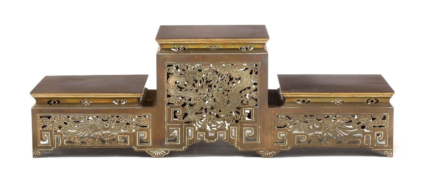 Promontoir en bronze de patine médaille en deux étages pour trois surfaces planes carrées à décor ajouré sur la face principale avant et arrière de deux dragons s’affrontant autour de la perle sacrée dans les nuages avec des emblèmes bouddhiques au centre et de phénix parmi des nuages stylisés sur les côtés.