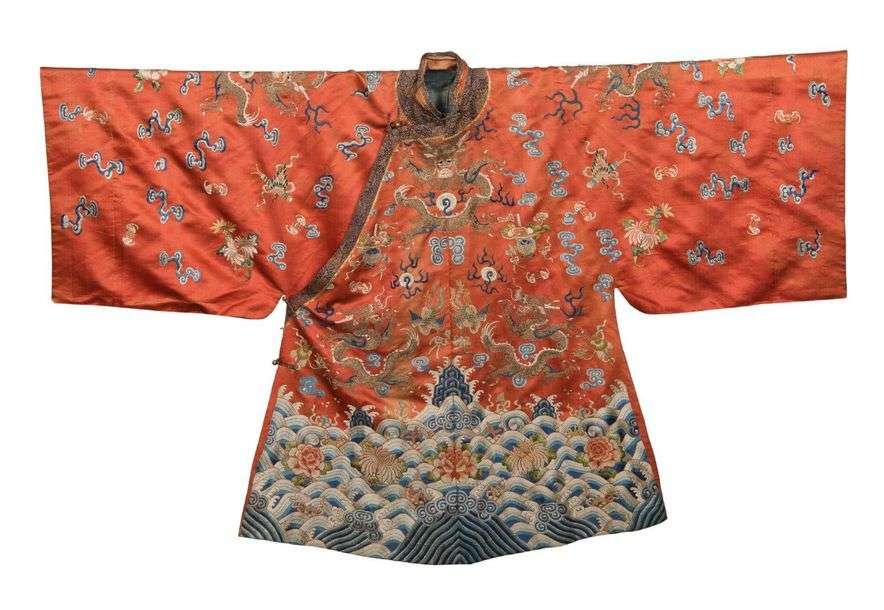 Robe à manches amples en soie corail brodée aux fils dorés et polychromes de huit dragons de face et de profil parmi des motifs auspicieux au-dessus de flots tumultueux où évoluent des chrysanthèmes et d'où émergent des pics sacrés. Le col et l'ouverture soulignés d'une bande de soie brochée dorée et bleu nuit. L'intérieur doublé de soie bleu ciel.