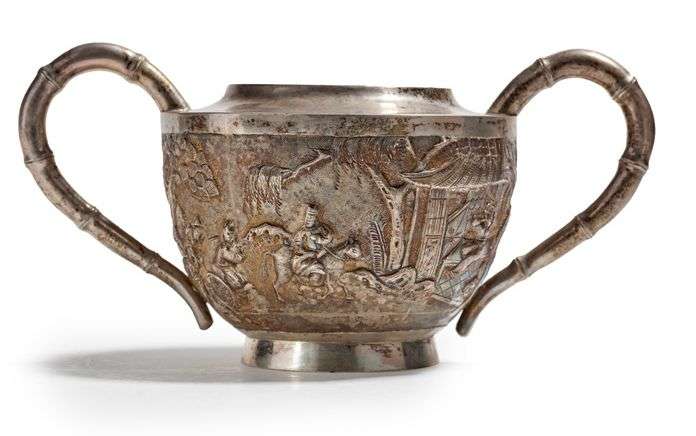 Sucrier en argent à décor de scènes animées de personnages, jeux et activités diverses.