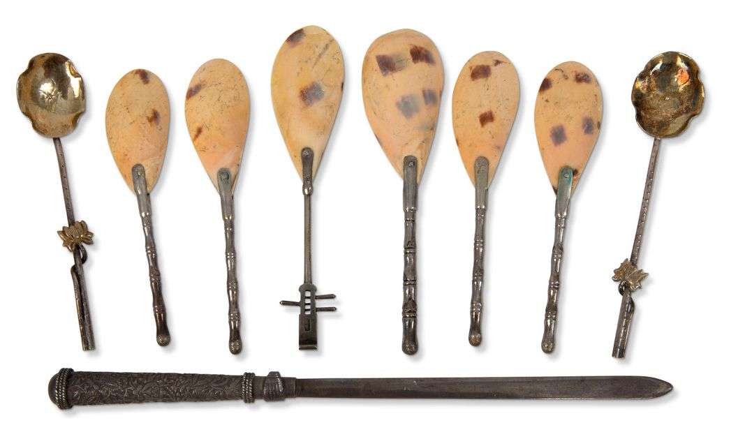 Lot comprenant onze objets dont une paire de petits vases sphériques à décor de chrysanthèmes et frises de grecques stylisées, un coupe papier, ensemble de huit cuillères dont deux en vermeil reprenant la forme de feuille de lotus, le manche orné pour chacune de pampre de vigne. Les six autres avec manches reprenant la forme du bambou et cithare. Poinçons