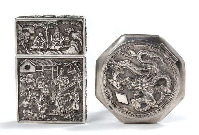 Ensemble comprenant un porte-cartes en argent à décor de divinités, et un poudrier en argent à décor de dragons et caractères shou de longévité au revers.