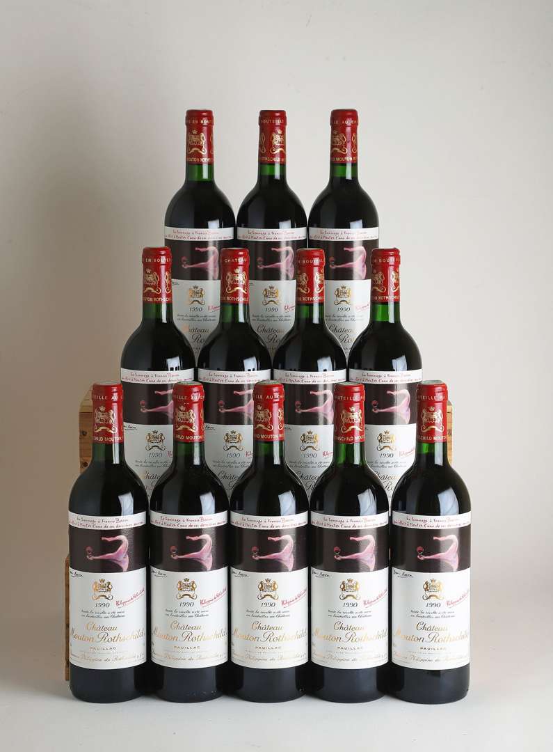 12 B CHÂTEAU MOUTON ROTHSCHILD (Caisse Bois d'origine) 3 B.G.+ et 1 B.G.- sinon parfaites) - 1990 - GCC1 Pauillac