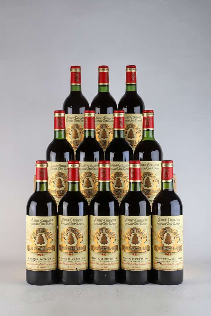 12 B CHÂTEAU L'ANGÉLUS (Caisse Bois d'origine avec inscriptions manuscrites) (6 B.G| 1 T.L.B| 4 e.l.a| 2 e.a| 3 bas de jupes de capsules abimées) - 1983 - GCC1A Saint-Emilion