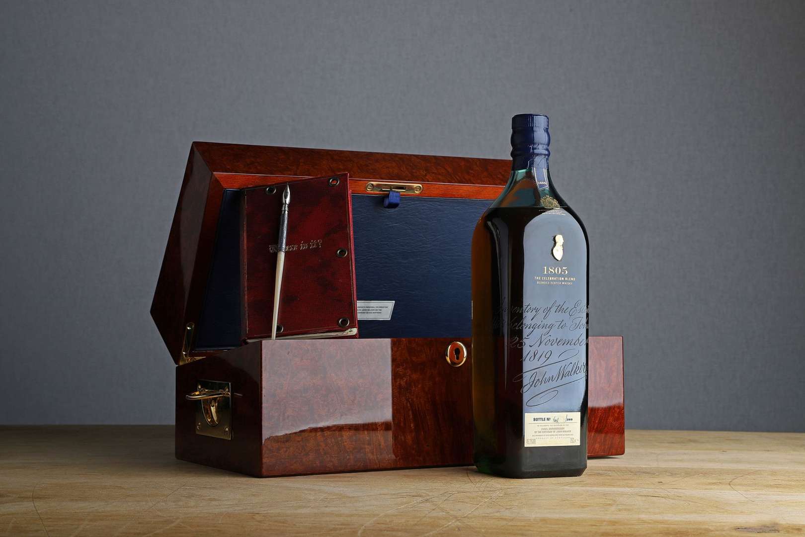 1 B WHISKY BLUE LABEL 1805 THE CELEBRATION BLEND 75 cl 46,3% Édition spéciale créée pour commémorer le 200ème anniversaire de la naissance de John Walker en 2005 bouteille n° 61/200 (Coffret en bois verrouillable avec une réplique du livre de recettes d'Alexandre Walker) (e.t.h. légères) - NM - Johnnie Walker