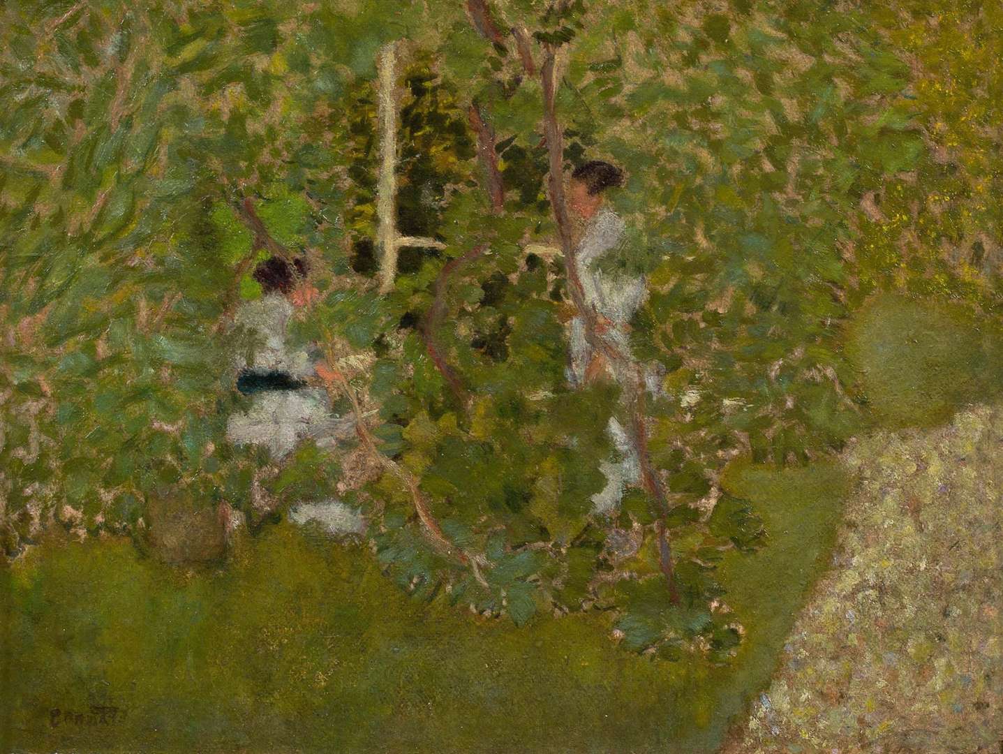 Aussitôt, il se met à acquérir les estampes japonaises qui deviendront, avec la photographie qu'il pratique avec passion, une source d'inspiration capitale pour ses tableaux et notamment pour La Charmille qu'il peint en 1901. Derrière un écran de verdure, la charmille qui donne son nom au tableau et qui n'est pas sans faire écho à La Cueillette peinte simultanément par Édouard Vuillard, Bonnard livre à notre curiosité deux figures féminines qui se font face. Il s'agit probablement de membres de la famille du peintre, surpris à converser dans un jardin bordé sur sa droite par une allée gravillonnée. Ces silhouettes, que l'on devine à peine, sont vêtues d'une même longue robe gris perle ceinturée à la taille à la manière d'un kimono privé de tout volume tandis qu'elles-mêmes semblent flotter dans un espace affranchi des contraintes traditionnelles de la perspective centrale. L'absence de profondeur conférée au champ pictural, à la manière d'un petit monde se suffisant à lui-même, et le rejet de la plasticité des corps ne sont pas les seules caractéristiques de la Charmille à mettre au crédit du japonisme de Bonnard. Il y a aussi la hardiesse de sa palette. Un camaïeu de vert, qui tire sa luminosité d'ajouts d'ocre et de blanc, et lui permet «d'exprimer toutes choses sans besoin de relief ou de modelé». Le peintre ajoute : «Il m'apparut qu'il était possible de traduire lumière, formes et caractère rien qu'avec la couleur, sans faire appel aux valeurs.» Autant d'éléments qui font de La Charmille le point d'orgue de la partition japoniste composée par Bonnard dès la Partie de croquet de 1892 (musée d'Orsay) et qui ne manquèrent pas de retenir l'attention de l'un de ses augustes propriétaires, Georges Bemberg, le plus grand collectionneur d'oeuvres de Bonnard de son temps.