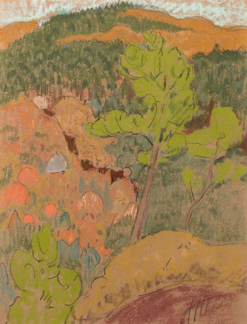 Its composition, in which vegetation and hills occupy almost the entire field, and the simplification of the forms of nature, borrowed from Japanese artists, make this pastel a typical work of the artist, which finds its full expression in the screen Paysage vallonné of 1910 kept at the Musée d'Orsay (RF MO P 2015 39) and presented in the exhibition Les Nabis et le décor (Paris, Musée du Luxembourg, 13 March-30 June 2019).