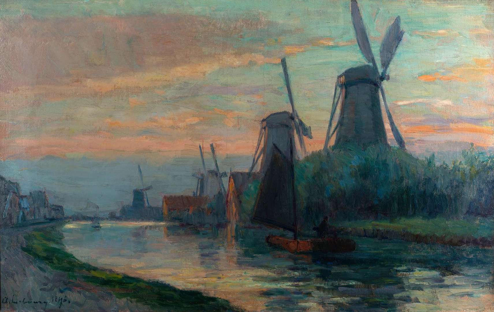 Moulins à vent sur la route de Rotterdam à Overschie, effet de soleil couchant