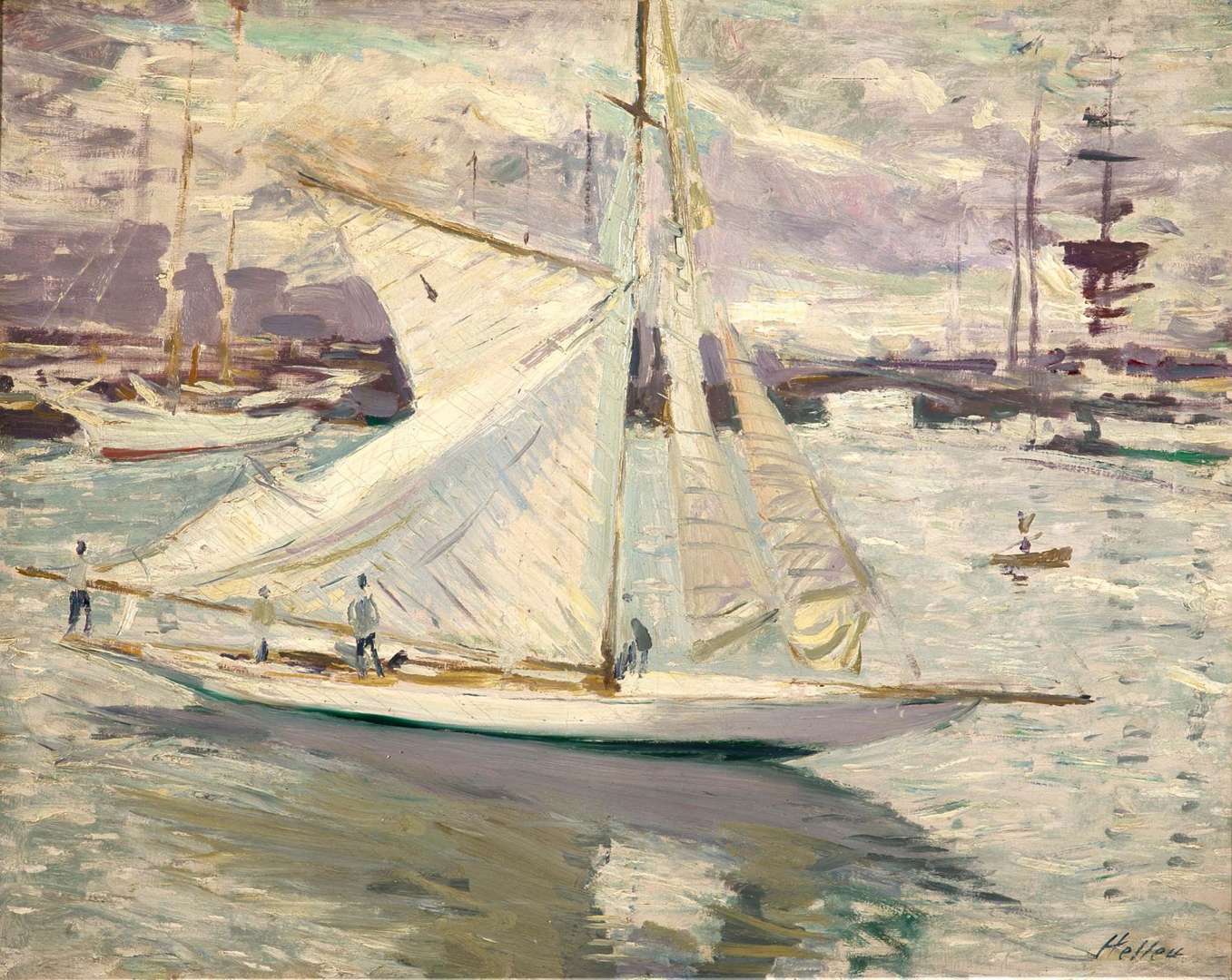PAUL-CÉSAR HELLEU Voilier blanc en régate «Helleu a bien ce regard fiévreux, ce visage tourmenté, les cheveux aile de corbeau vus jadis par Edmond de Goncourt. Il a de plus une barbe noire de saint François d'Assise, et les jambes héronnières que l'humoriste Gibson a crayonnées. Helleu me parle de son récent voyage. À peine débarqué à New-York, où toute la gentry voulait défiler en son atelier improvisé, (les Américaines, à la douzaine, alouettes attirées au miroir de cuivre, prenaient séance par téléphone), il a dû revenir, rappelé en France par la courte maladie d'une fillette idolâtrée.