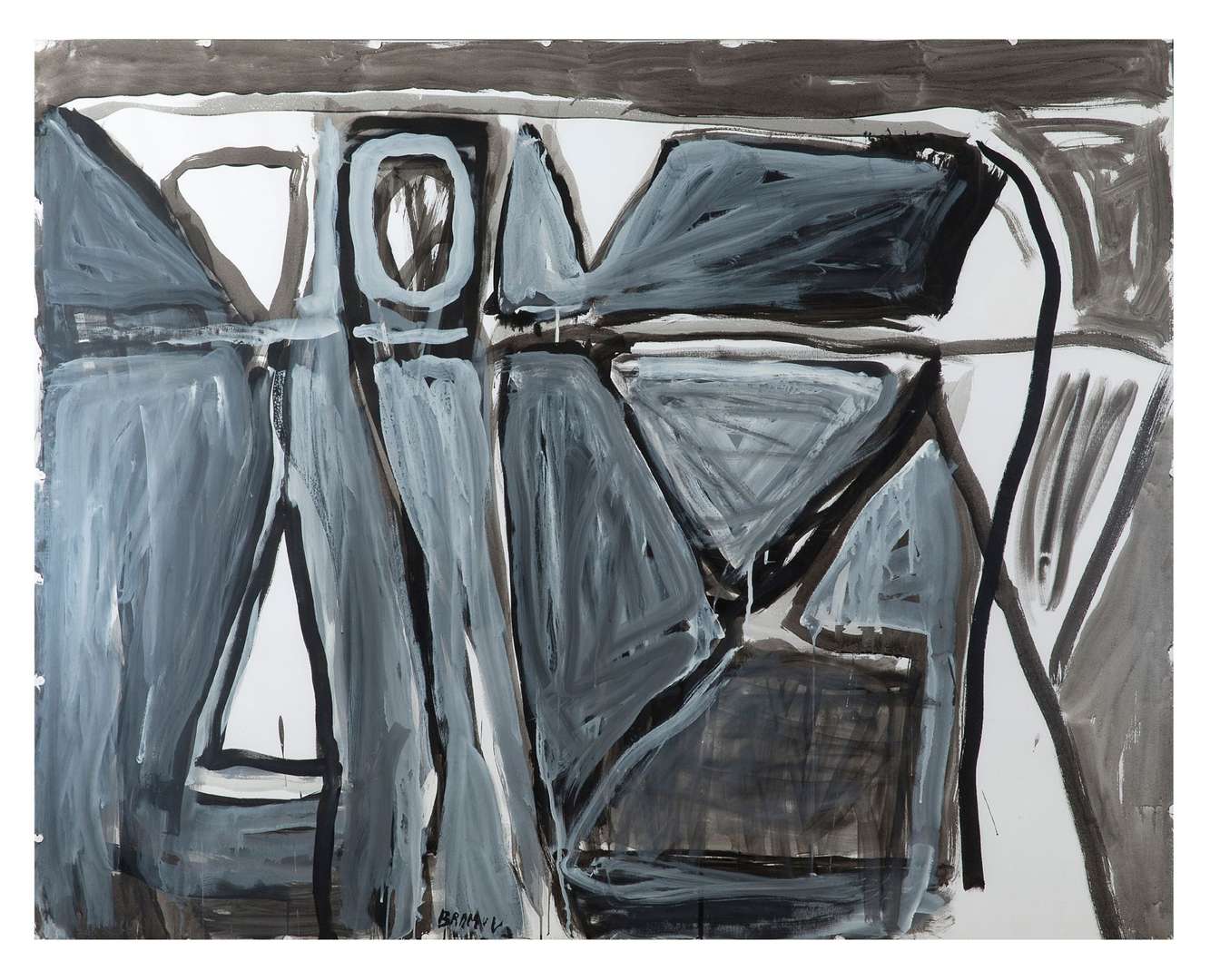 L’oeuvre que nous proposons aujourd’hui, datée de 1977, coïncide avec une période durant laquelle Bram van Velde bénéficie d’une reconnaissance du milieu artistique avec des rétrospectives organisées dans les grandes galeries et les musées en Europe. En effet, en 1973 il réintègre la galerie Maeght couronnant ainsi l’arrivée d’un succès si longtemps attendu et qui ne se démentira plus jamais. C’est également dans les années 1970 que Bram van Velde s’installe définitivement dans le Sud de la France. Peint à Grimaud ou bien à Arles, ce tableau présente plusieurs traits caractéristiques de Bram van Velde. Ayant abandonné le cubisme à la fin des années 1940, il continue cependant à travailler avec les formes géométriques notamment le triangle. Il en arrondit les angles et étire les proportions, associant la structure et rigueur de l’expressionnisme nordique à la courbe. Les formes s’amollissent et se cambrent, la peinture glisse et coule – Bram Van Velde affirme « peindre l’impossibilité de peindre ».