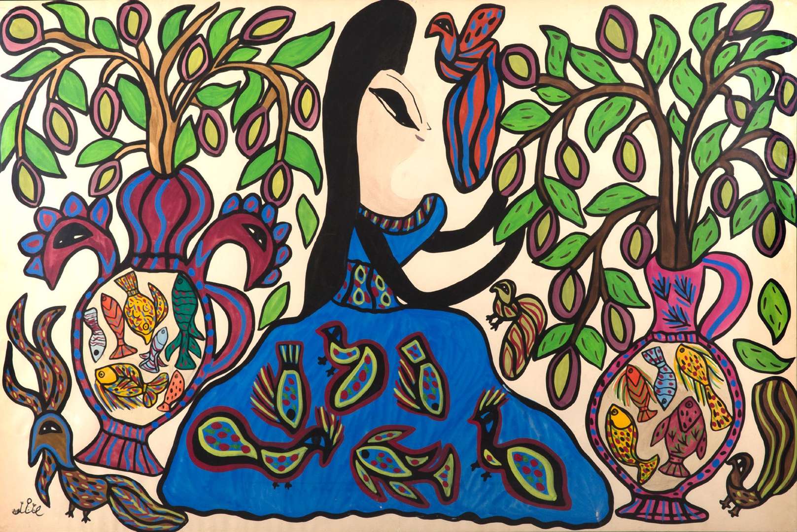 Gouache et aquarelle sur papier, signée et datée en bas à gauche, portant l'étiquette de l'exposition Baya à Laval au dos