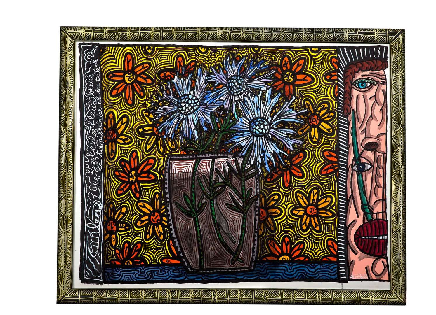 La toile s’organise en « vignettes » à l’intérieur desquelles des motifs cernés de noir se développent. Le cerne noir est un des attributs les plus typiques de la bande dessinée qui est une source d’inspiration pour le travail de l’artiste. Le sujet est un vase aux fleurs bleues, se détachant sur une tapisserie jaune. Dans cette démarche littéral et littéraire qui lui est propre, Robert Combas écrit à gauche de la toile le titre et le sujet de l’oeuvre. Il dit tout autant qu’il représente. La sensation de voir à travers le vase apporte du relief à la bidimensionnalité de la toile. Dans la partie droite, deux faces entremêlées ne semblant faire qu’une, un homme et un veau. L’intérieur du vase et l’intérieur de l’homme sont rendus visibles par des procédés originaux qui transcendent le genre de la nature morte.