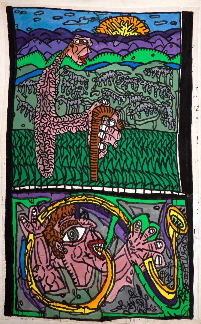Dans Le berger à la canne et le joueur oliphant plus coucher ou lever de soleil, deux scènes organisées en « vignettes » se déploient. Deux personnages sont affairés à des activités liées à la transhumance alpine : un berger guide ses moutons et un homme joue du Cor des Alpes, instrument utilisé en montagne pour communiquer entre les différents villages. La tradition semble être au coeur de cette oeuvre, mais aussi la symbolique forte du bâton de berger. Encore une fois, Robert Combas déjoue le côté bidimensionnel de sa toile en donnant une impression de transparence dans le traitement de la chair des personnages.