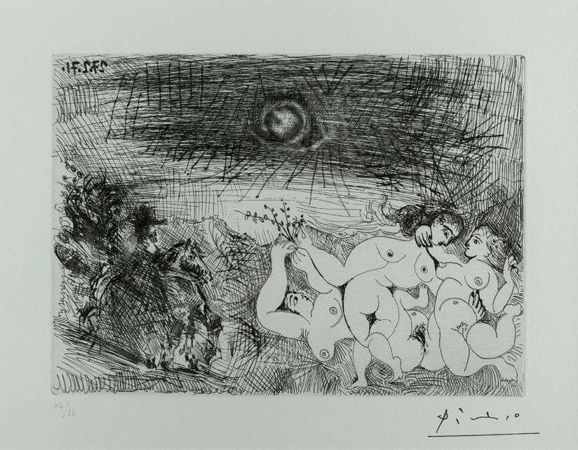 Eau-forte, grattoir pointe sèche sur vélin. Epreuve numérotée 44/50, portant le cachet de la signature édition de la Galerie Louise Leiris, 1978, série des 156 gravures 59. Cachet de l'ancienne collection H.M.Petiet au verso (L.5031). (Bloch 1914, B.Baer 1921 IIBa)