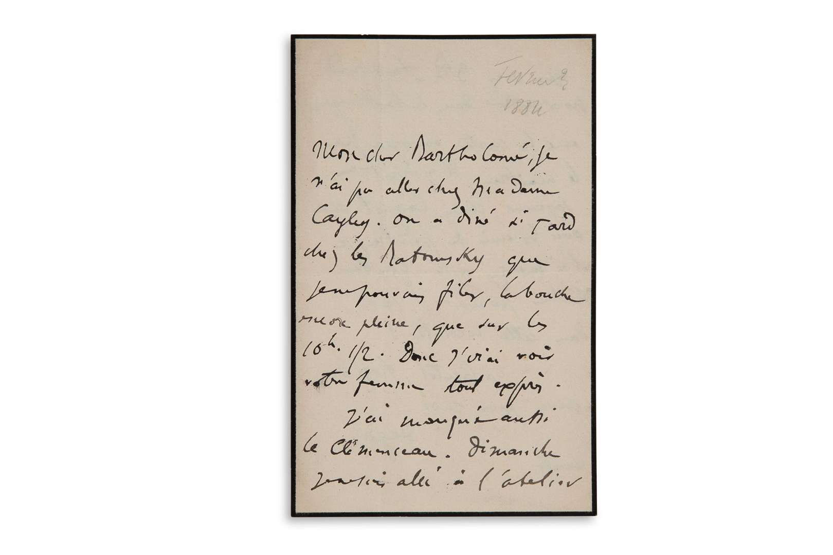 Lundi [février? 1884]. 2 pages in8 (petit deuil)
