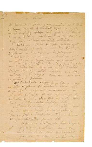 Gauguin vient d'être condamné et expose l'affaire à son avocat et ami, Léonce Brault, en vue de sa défense, moins d'un mois avant sa mort. [Gauguin avait dénoncé à l'administrateur des Marquises le gendarme Guichenay de Tahuata qui touchait des pots-de-vin des baleiniers américains| ce dernier chargea son collègue d'Ivaoa de poursuivre Gauguin pour «diffamation d'un gendarme dans l'exercice de ses fonctions»| Gauguin fut condamné le 31 mars 1903 à trois mois de prison et 55 francs d'amende, en application de la loi sur la presse| il charge aussitôt son ami l'avocat tahitien Léonce Brault (1858-1933) de sa défense, mais il meurt le 8 mai.] «Au commencement de février j'avais envoyé à Mr l'adm[inistrateu]r des Marquises une lettre lui demandant de faire une enquête sur les marchandises débarquées par le gendarme de Tavata des navires baleiniers afin de savoir si elles étaient en règle, sinon ce serait une conduite scandaleuse. Tout le monde sait ici les capitaines baleiniers ayant débarqué un très grand nombre de marchandises disant que le gendarme avait eu suffisament la patte graissée. [...] Ce que je voulais c'était comme c'est mon droit exiger une enquête d'autant plus que des indigènes ont été condamnés pour avoir reçu au lieu d'argent savon etc. voir même en paiement de prostitution». L'administrateur, au lieu de faire l'enquête, a demandé au gendarme de se mettre en règle| et Gauguin a alors récrit à l'administrateur, «déclarant que l'enquête n'ayant pas été ordonnée et faite je tenais le gendarme pour un parfait honnête homme», et retirant sa plainte... «Sur ce dans le courant de février le brigadier un grossier personnage vint à me menacer de beaucoup de choses entre autres de me poursuivre pour diffamation de la gendarmerie». Il a informé l'administrateur de ces menaces, mais a été poursuivi : «j