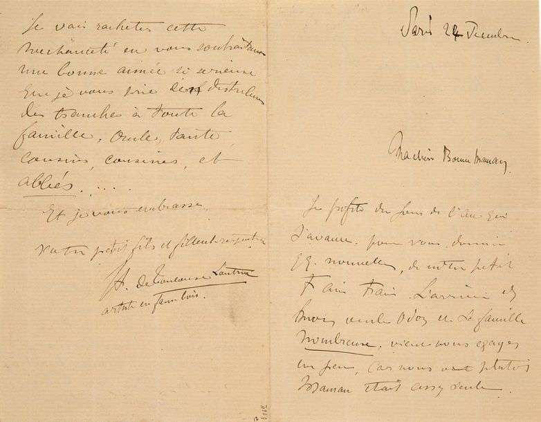 Lettre autographe signée adressée à sa grand-mère maternelle Louise Tapié de Céleyran. «Je profite du jour de l'an qui j'avance, pour vous donner quelques nouvelles de notre petit train train [...] Vous avez m'a t'on dit gouté les charmantes attitudes et les souliers vernis de mon bel ami, Louis. Vous devriez bien lui trouver une héritière et la lui jeter dans les bras [...] Je vais racheter cette méchanceté en vous souhaitant une bonne année si sérieuse que je vous prie d'en distribuer les tranches à toute la famille [...]».