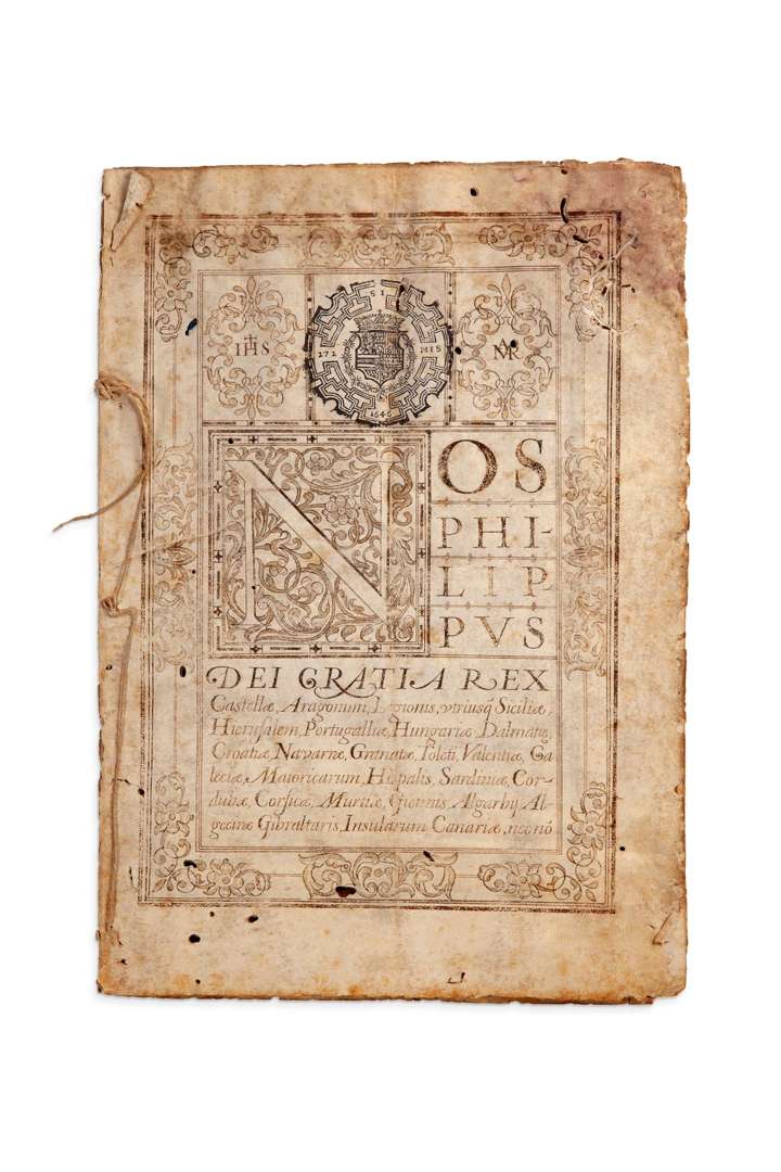 Espagne, Madrid, 2 décembre 1646. En latin et espagnol, acte enluminé sur parchemin, décor à la plume (armoiries peintes, f. 3r), 6 ff.