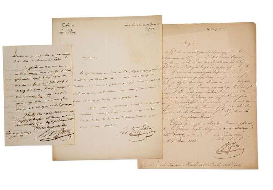 Cases veut bien se rappeler ma visite à Passy et je sens vivement toute la bonté qu'il y a dans ce souvenir. Quand elle saura que je suis devenu veuf, elle me pardonnera la vie retirée que je mène habituellement ici. Je suis trop malheureux pour ne pas aimer la solitude [...]. Je prends mes distractions dans nos tristes Annales!»... Tuileries 10 janvier 1832, au sujet d'une demande d'audience de Mr Touboulin... 5 mars 1834. Il a remis le bel ouvrage du Dr Vimont sur le bureau du Roi, qui le garde en attendant un moment pour le parcourir. «Je ne doute pas que l'examen personnel que le Roi se propose de faire n'ait pour résultat d'encourager les intéressantes études du Docteur par une souscription faite au nom de Sa Majesté»...