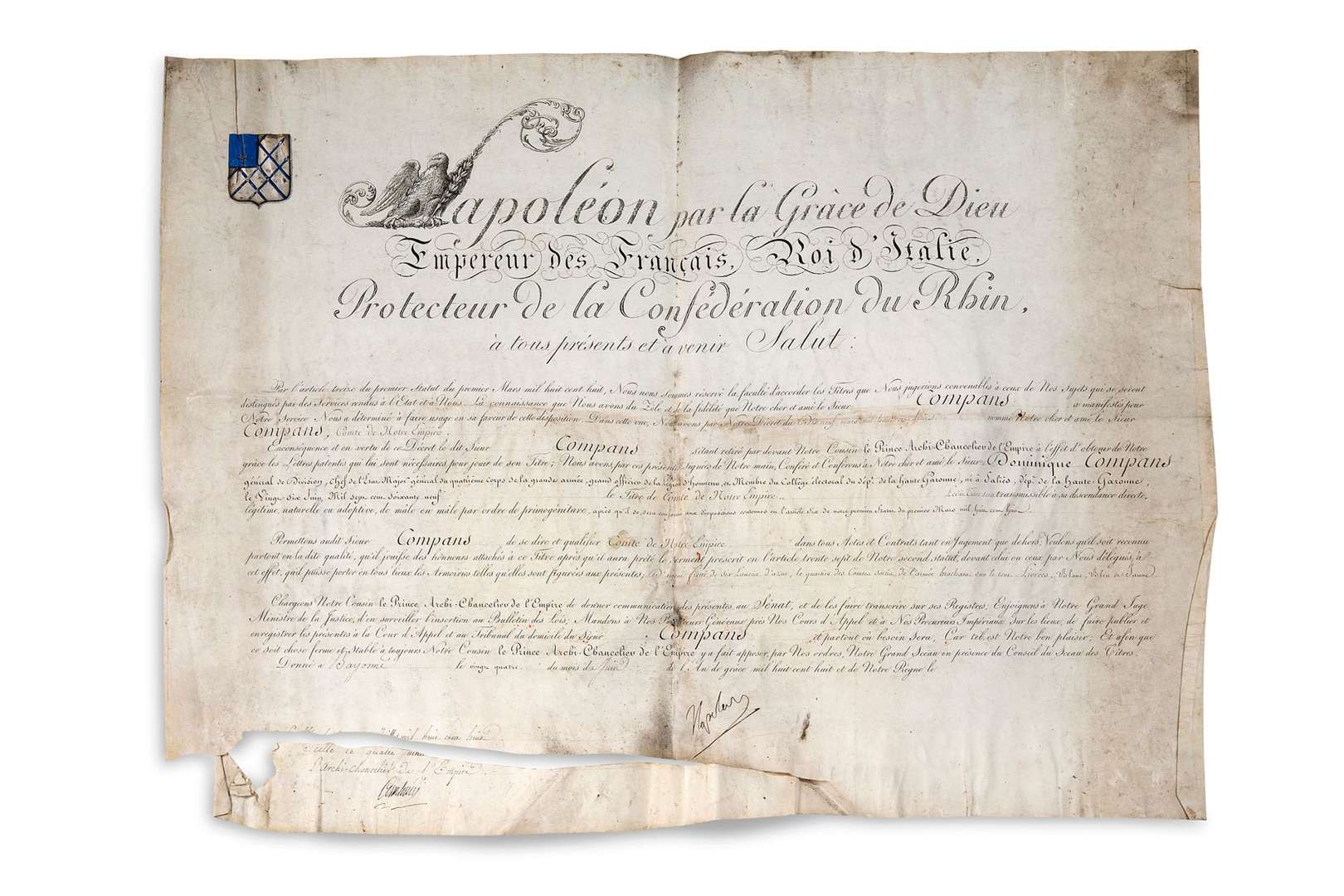 P.S. «Napoleon», Bayonne 24 juin 1808| contresignée par CAMBACÉRÈS, Archi-Chancelier de l'Empire| vélin in-plano en partie gravé à l'en-tête Napoléon par la Grâce de Dieu Empereur des Français, Roi d'Italie, Protecteur de la Confédération du Rhin... avec lettrine à l'aigle, armoiries peintes (sans le sceau| déchirure au bas sans manque).