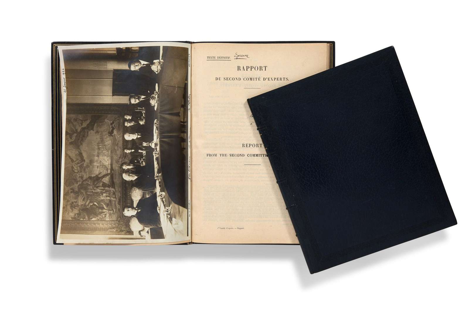 On joint l'épreuve du Rapport du second Comité d'experts de la Commission des Réparations, 1924 (relié à l'identique par Gruel), avec envoi d'André ATTHALIN à Horace Finaly (5 avril 1924), avec la photographie du Comité d'experts, signée par les 5 membres: Mario Alberti, A. Atthalin, Albert E. Janssen, Reginald McKenna Henry M. Robinson.