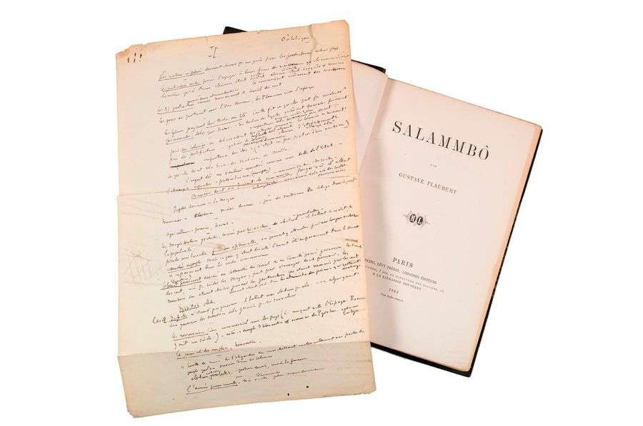 Durant 59 mois, Flaubert se consacra à l'élaboration de Carthage, qui deviendra Salammbô. Il entreprit de se renseigner sur son sujet et découvrit les exigences d'une nouvelle méthode - l'écrivain-chercheur. Les travaux de recherches déployés pour l'écriture furent immenses| des centaines d'ouvrages mis en fiches, près de2000 folios de brouillons.