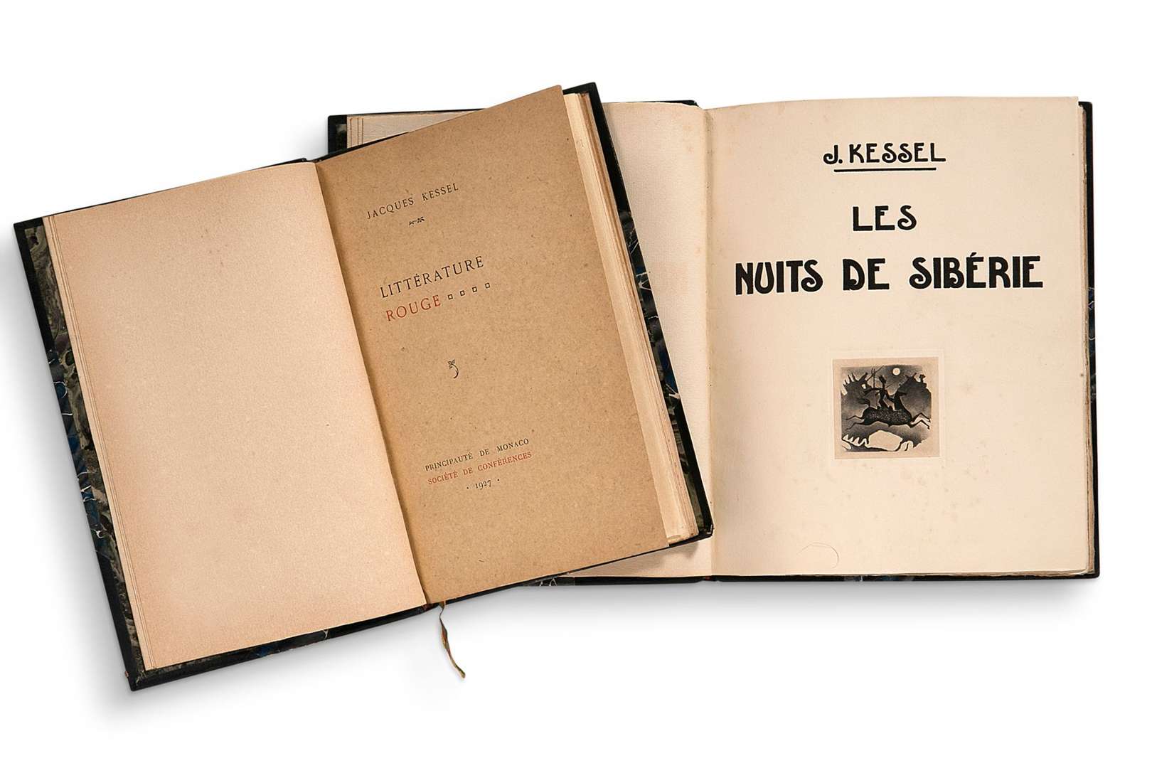 - Nuits de Montmartre. Paris, les éditions de France, 1932. In-12, 256 pp. Demi-basane brune, dos à nerfs titré, tête jaspée, couverture conservée (reliure postérieure). Édition originale. L'un des 64 exemplaires sur papier alfa hors commerce (n°XVII), nominatif pour Boris Aslan Finaly, dédicacé et signé à l'encre bleue par Kessel au faux-titre.