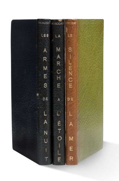 Le Silence de la mer. - Les Armes de la nuit. - La marche à l'étoile. Paris, Éditions de Minuit, 1946. 3 volumes grand in-12, maroquin bleu et vert, têtes dorées sur témoin, couvertures et dos conservés, le tout placé sous un étui bordé (Reliure de l'époque).