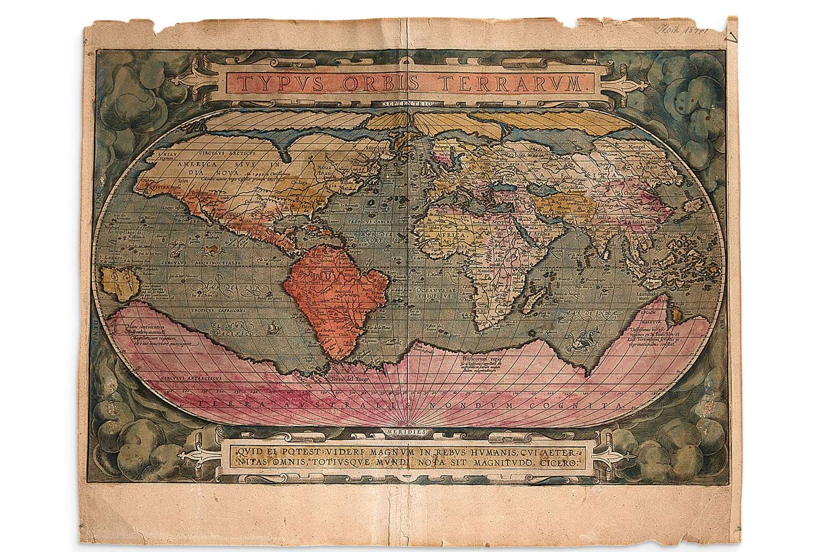 PREMIÈRE VERSION (sur 3) de la mappemonde par Ortelius telle que parue dès 1570 dans son célèbre Theatrum Orbis Terrarum, le premier atlas au sens moderne du mot.