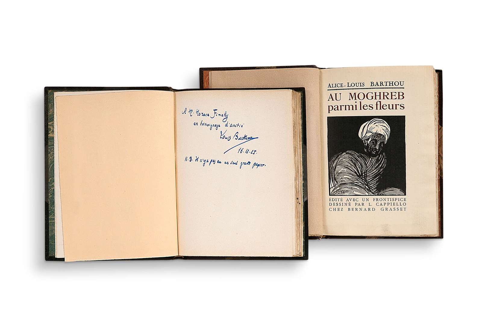 - BARTHOU Alice-Louis, Au Moghreb parmi les fleurs. Paris, Grasset, 1925. In-8, 175 pp. Demi-maroquin brun à coins, dos à nerfs titré, monogrammé en queue, et orné de fers dorés, tête dorée, couverture conservée (reliure postérieure).