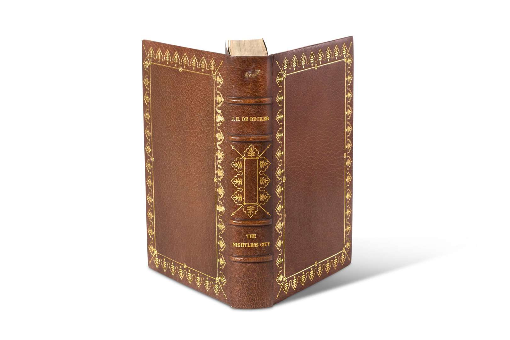 In-4 (250 x 190 mm), 386 pp., en anglais. Maroquin havane, filet doré et large frise de végétaux en encadrement des plats, dos à nerfs titré et orné d'un large fer doré, tête dorée, contreplats bordés de maroquin avec triple filet doré et fleurons angulaires, gardes de papier moiré zébré, doubles gardes de papier marbré, étui conservé (reliure signée René Kieffer).