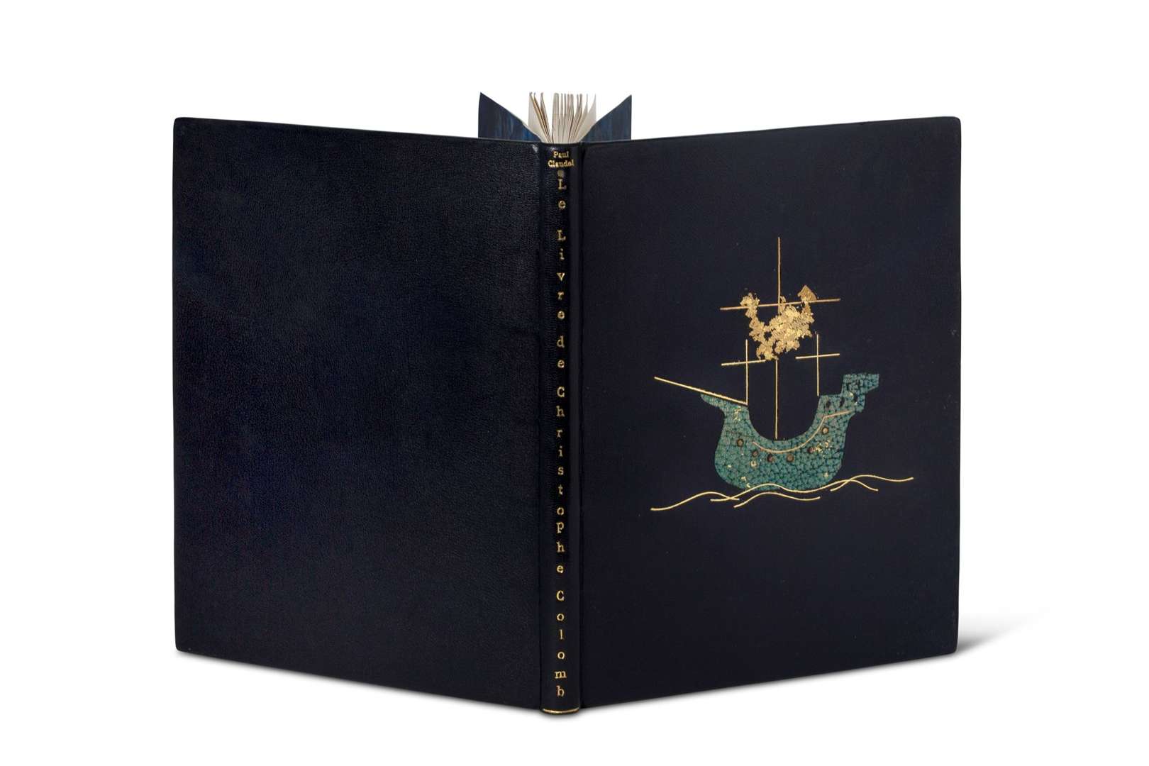 In-4 (290 x 235 mm), 66 pp. Plein maroquin bleu nuit, plat supérieur serti d'un motif central estampé à froid et doré, rehaussé à la feuille d'or, représentant le bateau ornant la couverture d'édition, dos lisse titré or en long, tête dorée, couverture illustrée et dos conservés, gardes de papier marbré (reliure signée Loutte).
