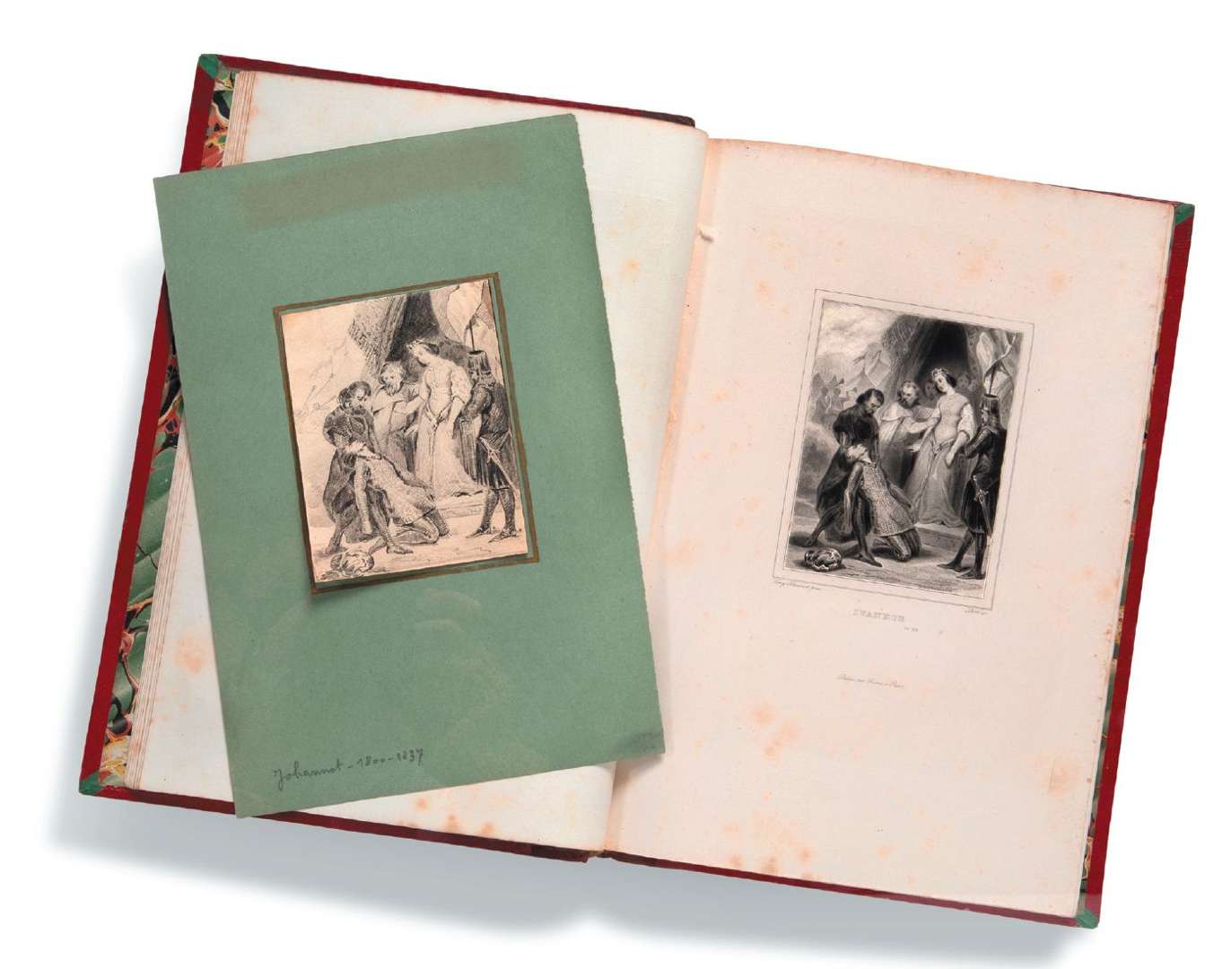 Un dessin original au crayon de Tony Johannot représentant une scène du chapitre XII de l'Ivanhoé de Walter Scott, gravée dans le recueil, est joint dans le recueil.