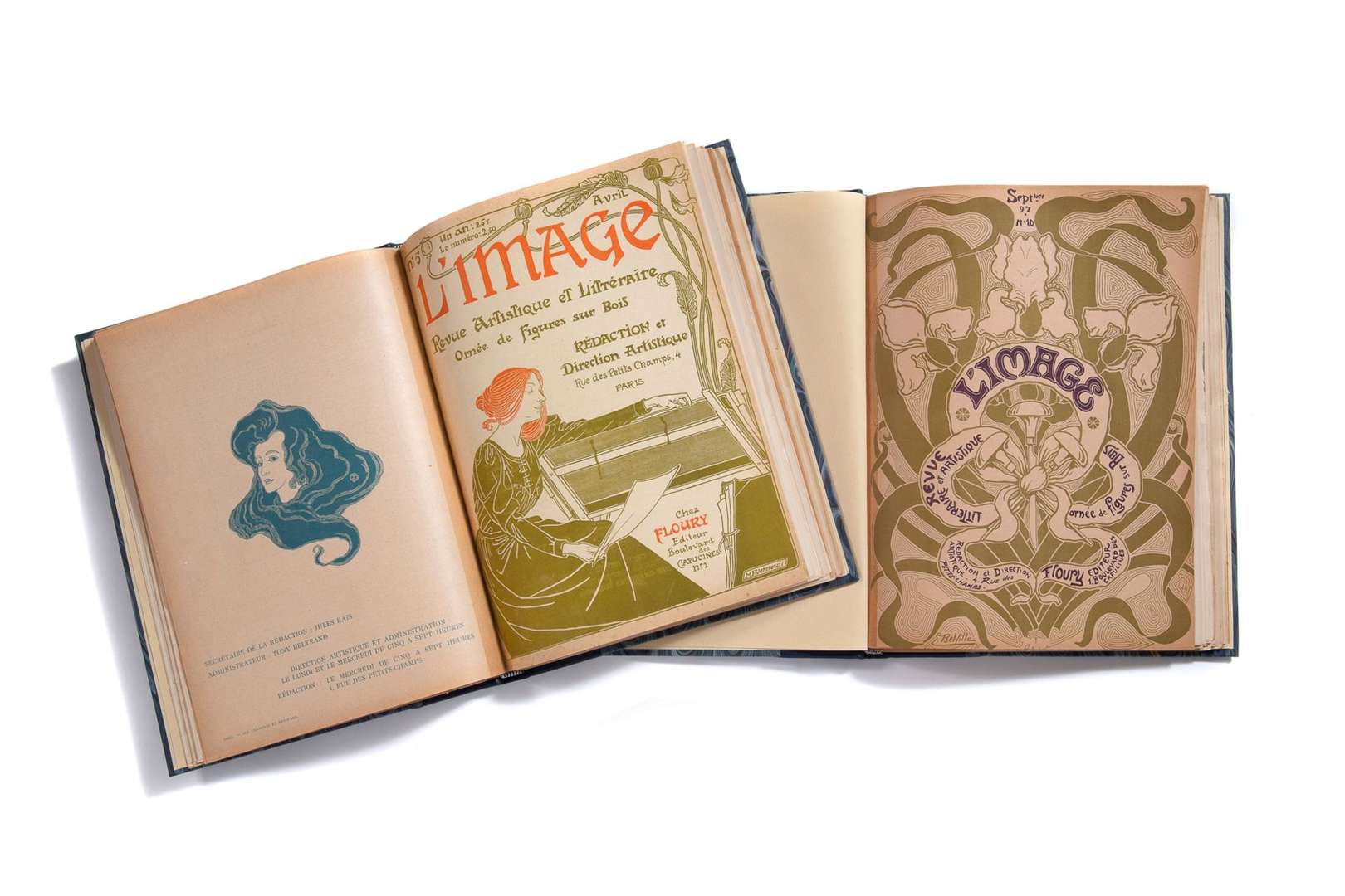 Revue littéraire et artistique contenant des textes de Barrès, Louÿs, Margueritte, Montorgueil, Régnier, Verhaeren, etc... ornée de nombreuses planches de Carrière, Daumier, Degas, Denis, etc... Avec les couvertures des livraisons par Mucha, Toulouse-Lautrec.