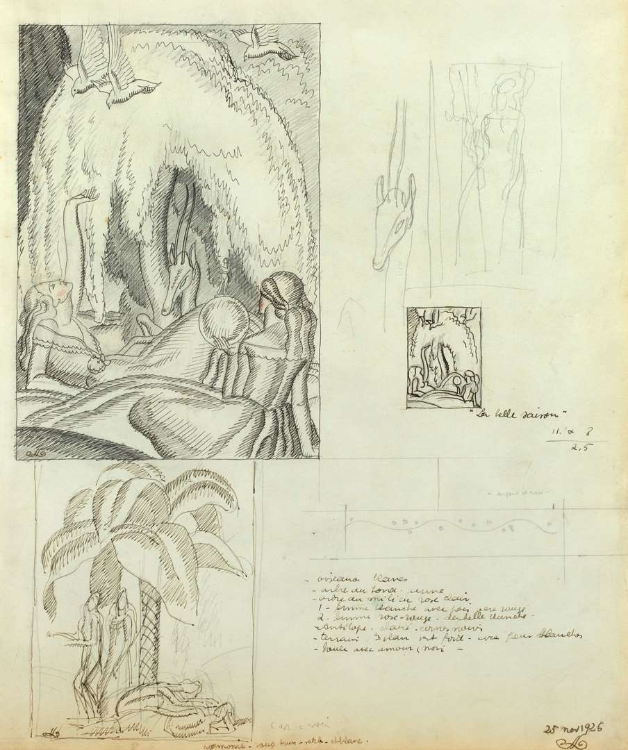 Il est intéressant de constater les similitudes de la biche du centre de la composition avec celle que son ami le sculpteur Alfred Janniot réalisa en marbre pour la grande Exposition Internationale de 1925.
