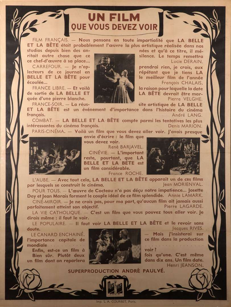 Affiche pour le film de Jean Cocteau avec Jean Marais et Josette Day (1946). 160 x 120 cm.