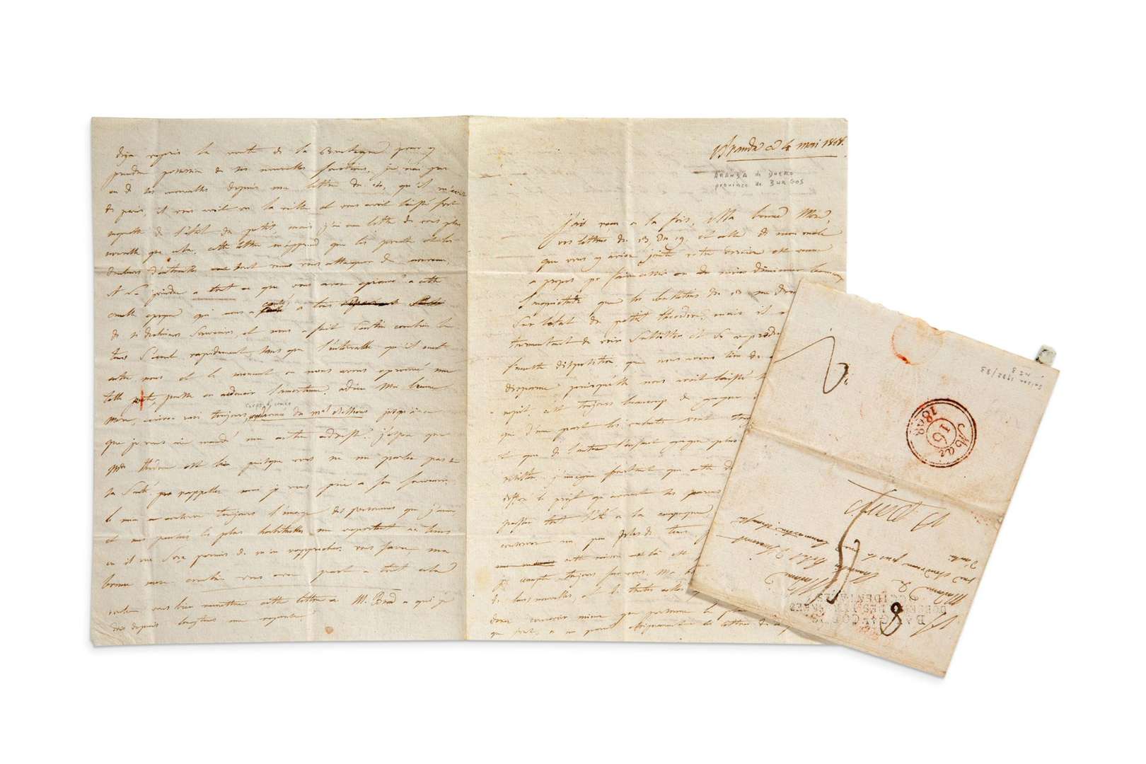 L.A. du soldat CHAUVELIN, Aranda 4 mai 1808, à sa mère Mme de Chauvelin, à Paris | 4 pages in-4, enveloppe avec marque postale militaire Bau Gal Corps d'observ. des Pyrénnées Occidentales.